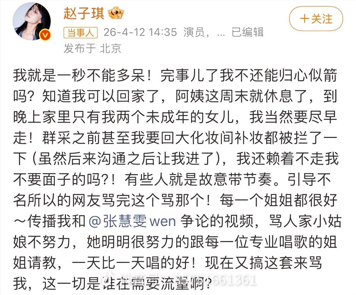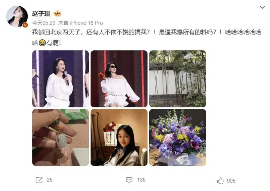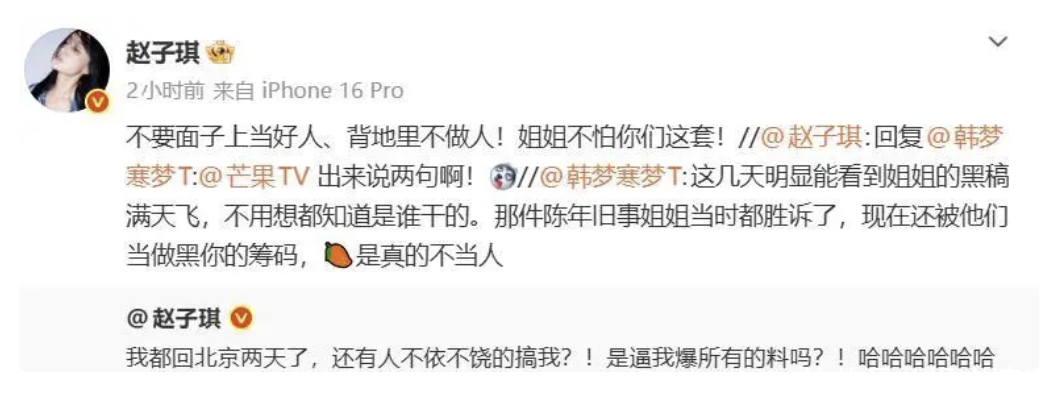 16日凌晨赵子琪突然微博喊话并直接@芒果TV:我都回北京两天了,还有人不依不饶的告我,是逼我爆所有的料吗?