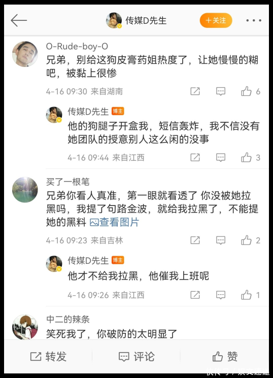 明眼人都知道她在说什么,明眼人也知道传说中的“传媒D先生”也一定会开团秒跟,毕竟据D先生自爆,他被粉丝开盒了,这口气不较真到底根本咽不下去!