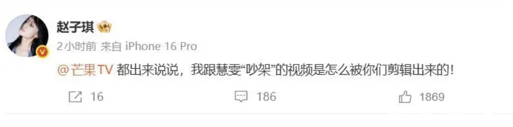 赵子琪可以理解节目组为了制造话题和博流量搞营销,但她忍不了节目组毫无底线的扭曲事实,更何况还是用她当祭品,所以16日凌晨她连发多条微博,剑指芒果台!